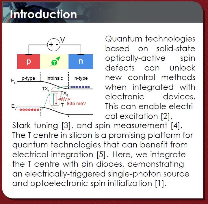 The T centre is a silicon colour centre which hosts long-lived spins and a spin-photon interface with emission in the telecommunications O-band, making it a promising platform for quantum technologies. We integrate T centres with silicon nanophotonic devices and p-i-n diodes for electrical excitation, observing electroluminescence from both ensembles and single T centres—an electrically-injected single-photon source. Using electrical excitation, we demonstrate a new method of spin initialization by heralding on the emission energy, enabling a parallelizable control scheme for networked devices.