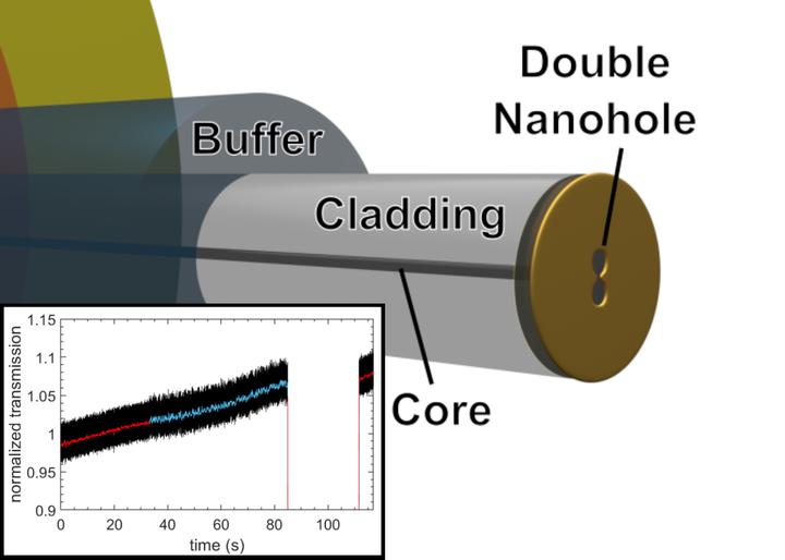 Optical trapping using nanoapertures such as double nanoholes (DNHs) is a useful technique for analysing proteins and other small particles which unfortunately is inaccessible for many due to the complicated optical setup and nanofabrication requirements. Integrating a DNH aperture on the tip of an optical fiber greatly simplifies the technique as it allows for fully fiber-based trapping systems which require only minimal optics experience. Previous works have demonstrated nanoaperture optical fiber tweezers, but fabrication has been based on expensive top-down approaches. This work presents a method to fabricate nanoaperture optical fiber tweezers by colloidal pattern transfer with a low-cost pattern fabricated using colloidal lithography. Results of optical trapping using a fabricated nanoaperture fiber tweezer with a polystyrene nanoparticle size standard are also presented.